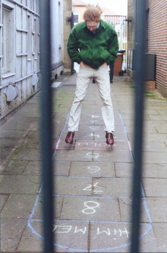 Trotzdem habe ich hier als Kind manchmal - und durchaus auch gern - gespielt, da ich in der Nähe aufgewachsen bin. Im Rahmen der Gruppenausstellung "Statt Blumen" platzierte ich an verschiedenen Stellen des Engesohder Friedhofs jeweils mehrere bunte Styroporkugeln verschiedener Größe. Sie markierten als Spielbälle die Plätze, die für mich damals von Bedeutung gewesen sind, hatten beim Gang über das Gelände einen hohen Wiedererkennungswert und verwiesen gleichzeitig auf die skizzierte Ambivalenz des Ortes. Am Seiteneingang beim Döhrener Turm empfing die Besucher ein mit farbiger Kreide auf die Steinplatten gezeichnetes Himmel+Hölle-Spiel. Zusätzlich konnte ein Walkman mit Kassette, auf der ich erzähle, welche Bedeutung der Friedhof für mich als Kind hatte, im Büro der Friedhofsverwaltung für einen Rundgang entlang der einzelnen Stationen ausgeliehen werden.