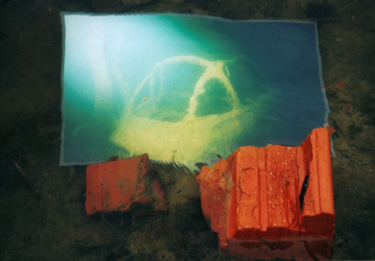 Diese Arbeit ist mein Beitrag zur Ausstellung Kunst+Natur im Garbsener Stadtpark. An zehn Stellen rings um den Schwarzen See hatte ich ufernah Spuren aus Ziegelbruch ins Wasser gelegt, jeweils begleitet von einem laminierten Foto. Damit wollte ich auf den industriellen Ursprung des heute so idyllisch in eine Parklandschaft integrierten Sees - eine alte Tonkuhle - aufmerksam machen. In der Umgebung gab es bis Mitte letzten Jahrhunderts mehrere Ziegeleien, deren Produktion maßgeblichen Anteil an der hannoverschen Bautätigkeit hatte. Hohe Schornsteine prägten damals das Bild der Landschaft. Ganz in der Nähe lassen sich noch die Überreste eines alten Brennofens entdecken. Bei den Fotografien handelte es sich teils um Aufnahmen von alten Plänen und Konstruktionszeichnungen aus dem Regionalarchiv, teils um Unterwasseraufnahmen - auf dem Grund des etwa 40 Meter tiefen Gewässers befinden sich nämlich noch die Überreste alter Anlagen. Zwei von mir angefertigte Schwimmobjekte sollten bei den Spaziergängern zusätzlich den Eindruck wieder aufgetauchter Fundamente erwecken. Allerdings waren sie, ebenso wie die Tonspuren, bereits 14 Tage nach der Eröffnung zerstört.