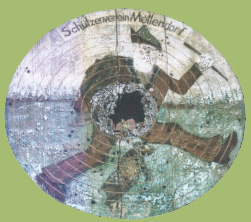 Bei den Abbildungen handelt es sich um Ausschnittvergrößerungen aus der Mellendorfer Schützenscheibe von 1929, die mir bei der Straßenbegehung für die Ausstellung an einem Fachwerkhaus unweit dieser Wand sofort ins Auge gesprungen ist und mich berührt hat aufgrund ihrer ungewöhnlichen Gestaltung und der fehlenden, da zerfetzten Mitte (entweder durch hohe Anzahl der Treffer oder Verlust einer ursprünglich aufgesetzten schwarzen Zielscheibe). Solche Scheiben an den Giebeln sind ja recht typisch für Ortschaften im ländlichen Raum, für mich allerdings immer auch zwiespältig besetzt, wird hier doch auf Darstellungen von Lebewesen gezielt - aktuell denke ich dabei auch an das martialische Training sowohl von Terrorgruppen als auch Einsatzkommandos zu deren Bekämpfung, die am feindlichen Abbild für den "Ernstfall" üben .